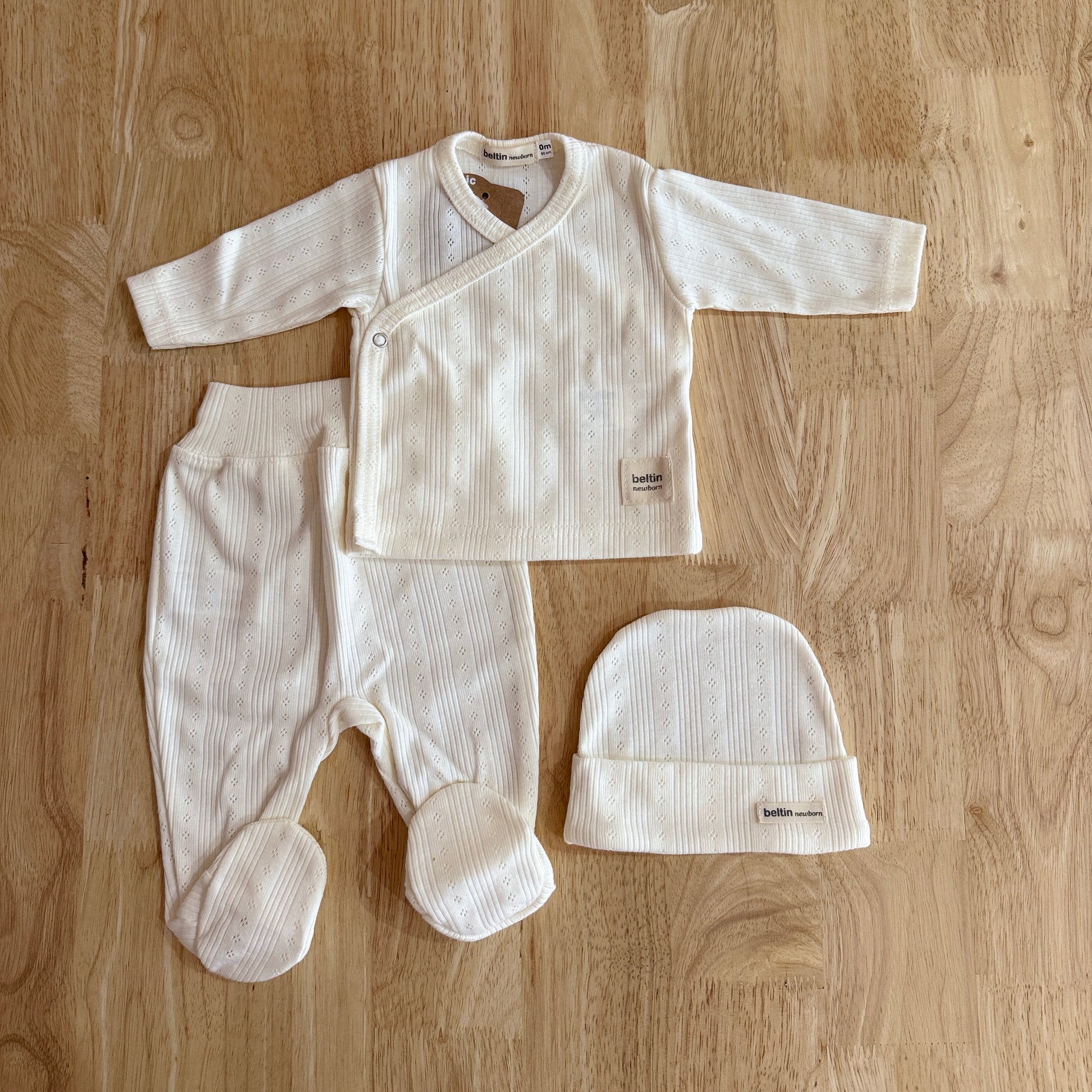El conjunto Bali combina la tradición con un diseño contemporáneo que no compromete la comodidad y protección esencial que requieren los bebés durante sus primeros días de vida.