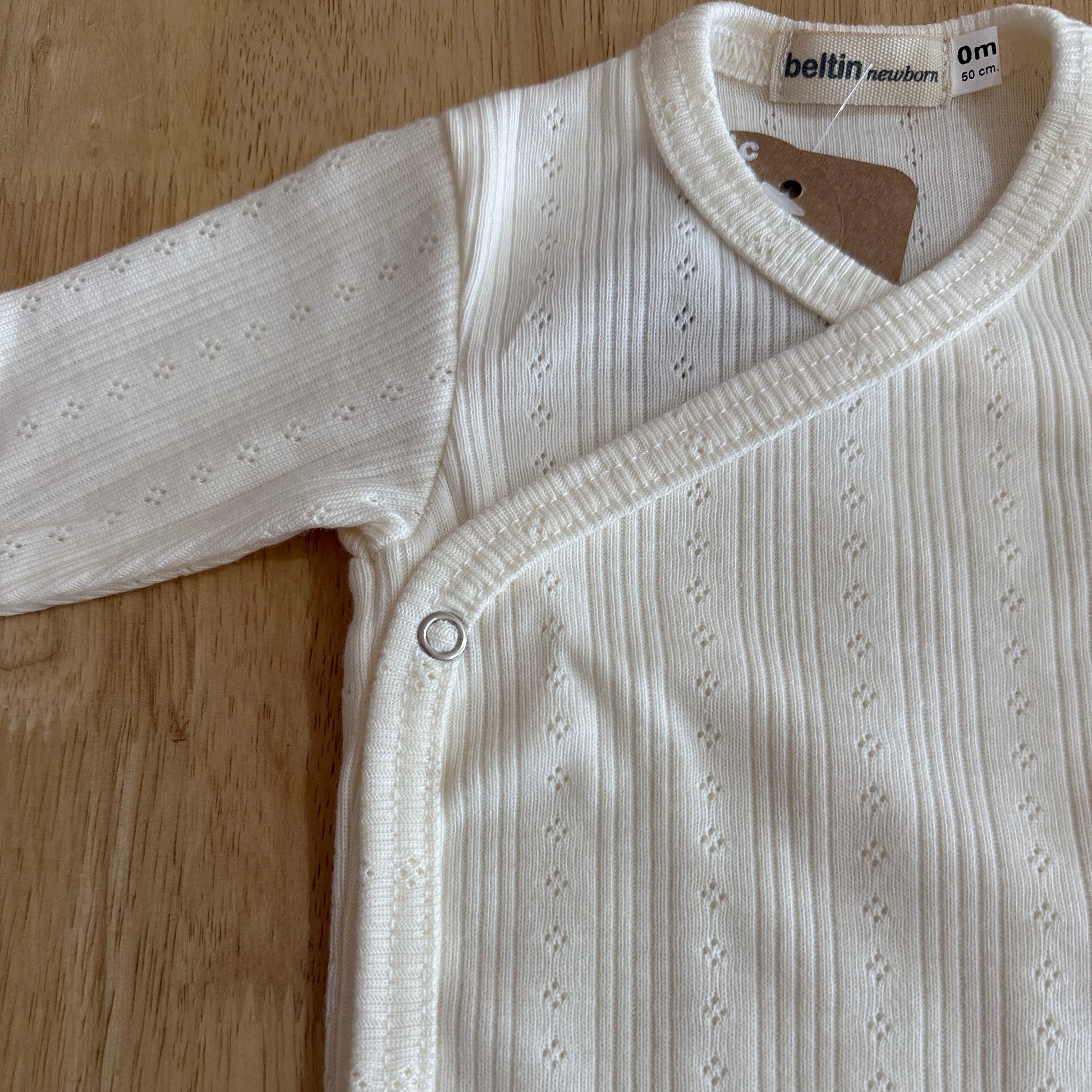 La chambrita cuenta con cierre frontal mediante broches libres de níquel, lo cual facilita el vestir del bebé y permite realizar las curas del ombligo sin necesidad de desvestirlo completamente. Su diseño cruzado es especialmente práctico para vestir al recién nacido con mínima manipulación.